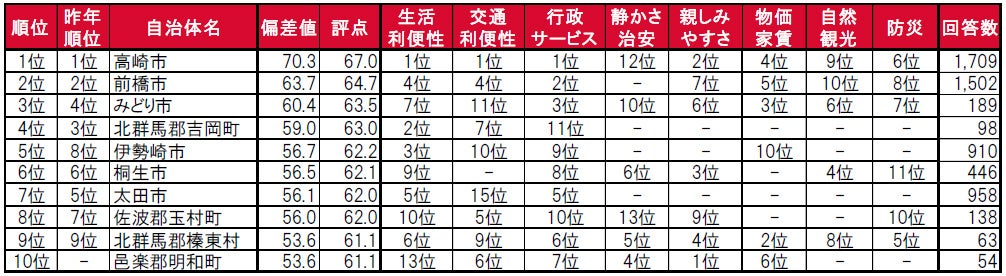 - 街の住みここちランキング2022<群馬県版>自治体TOP10 因子別順位