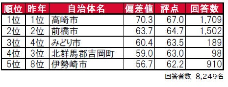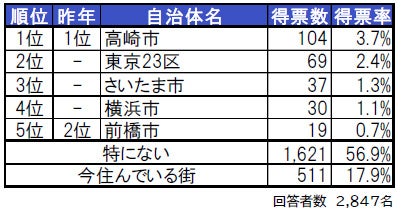 昨年は群馬県内の自治体のみを対象として集計していましたが、今年は全国の自治体を対象とした結果、上位5自治体のうち3自治体(東京23区、さいたま市、横浜市)が県外の街という結果となっています。