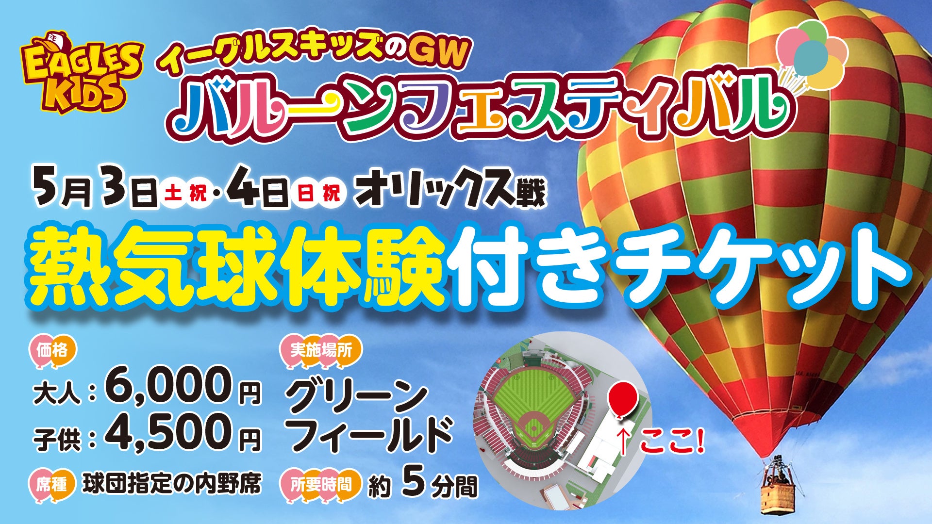 株式会社楽天野球団(本社:宮城県仙台市宮城野区、代表取締役社長:森井 誠之)は、イーグルスキッズが楽しめるイベントとして、5月2日(金)~4日(日・祝)『イーグルスキッズのGW~バルーンフェスティバル~』を開催することとなりましたので、お知らせいたします。