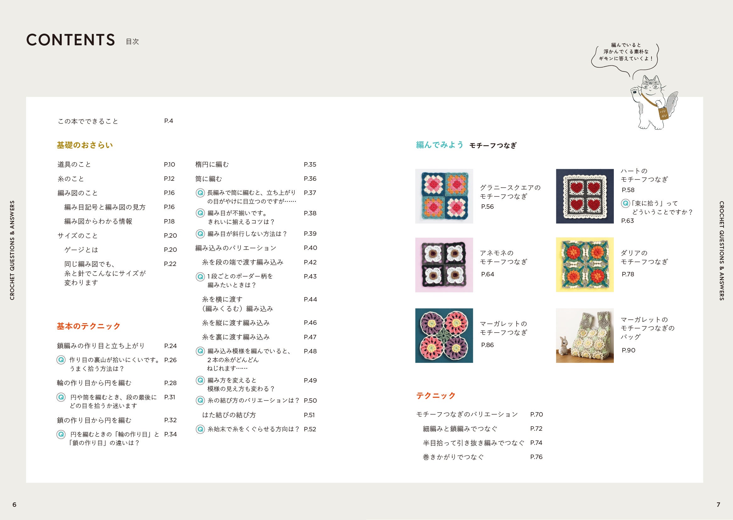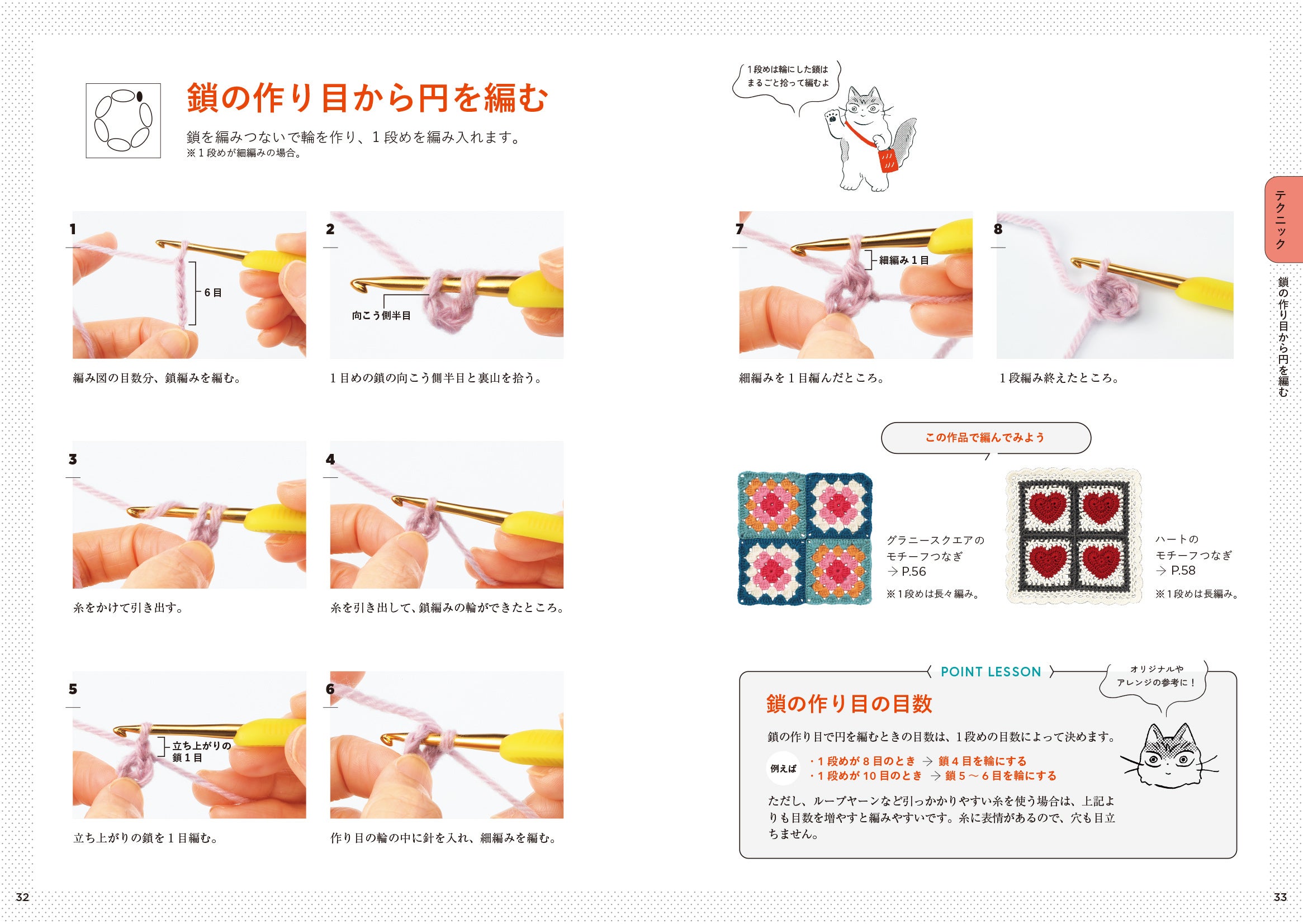 また、編んだアイテムを実用的な作品に活用するためのアレンジ方法や、長く愛用するためのケア方法も紹介。巻末には、学んだことを実践できるモチーフつなぎ、あみぐるみ、バッグなどのレシピつき。
