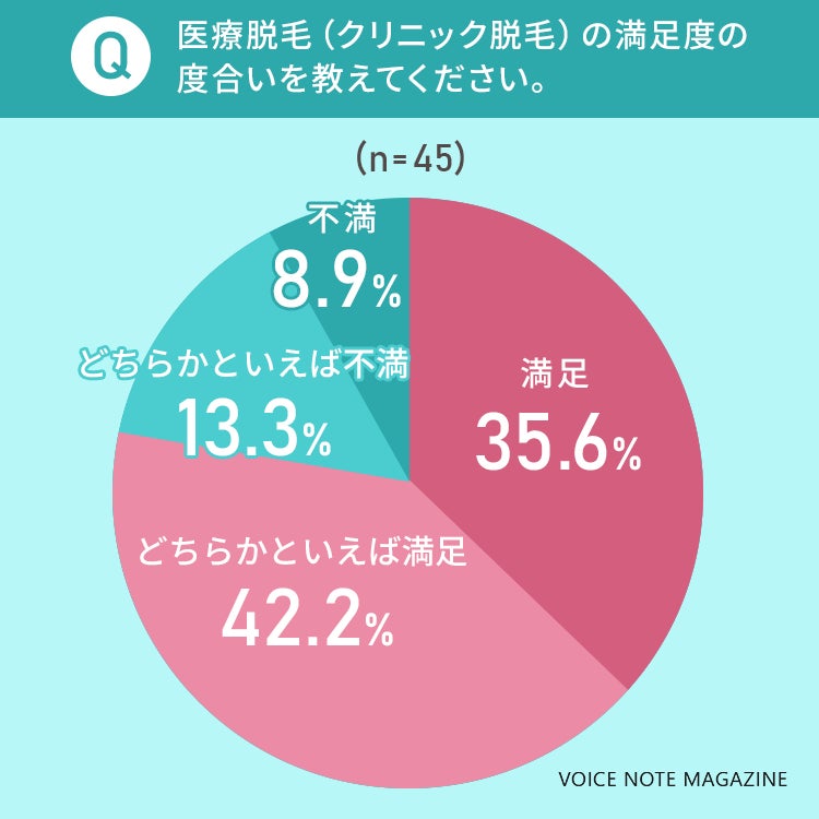 事前調査で「医療脱毛の経験がある」と回答した女性のボイスノート会員45人に、医療脱毛の満足度について聞きました。