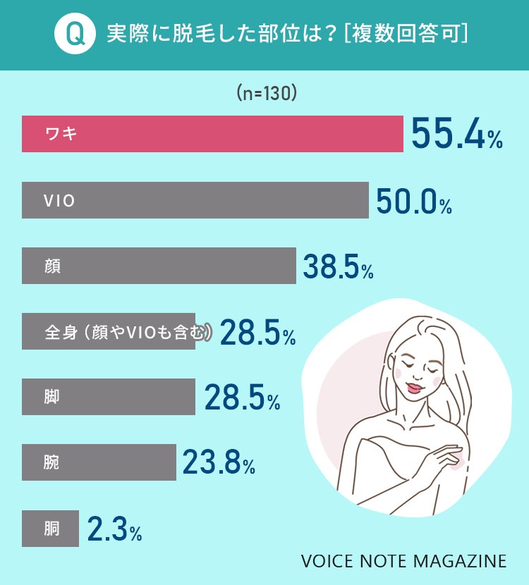 続いて、事前調査で「脱毛をしたことがある」と回答した女性のボイスノート会員130人に、実際に脱毛した部位について聞きました!