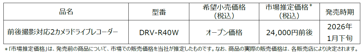前後撮影対応2カメラドライブレコーダー「DRV-R40W」を発売