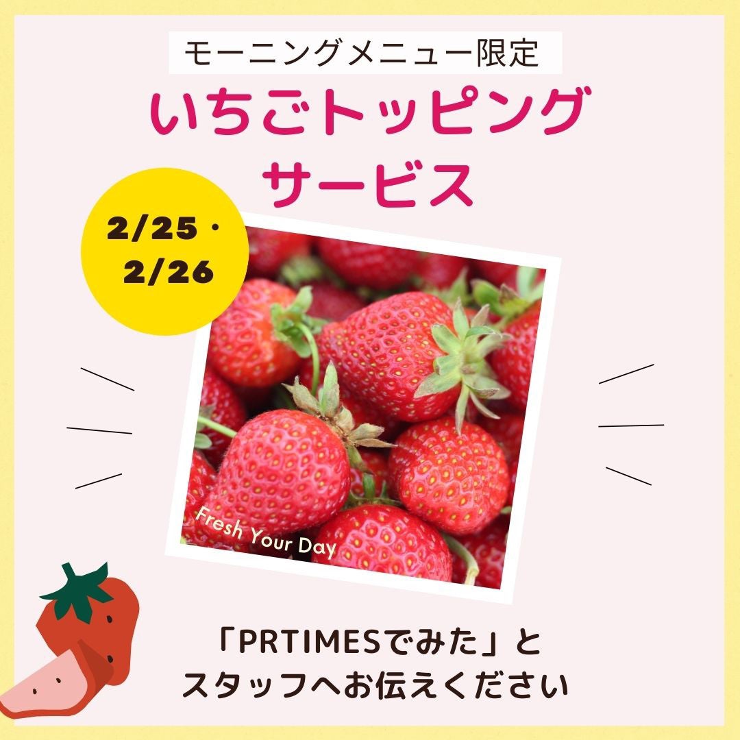 New York Kitchen ARAI(ニューヨークキッチンアライ)イオンスタイル碑文谷店7階(運営:株式会社RAVIPA 本社:東京都豊島区)では、モーニングメニューご注文の方限定でフルーツ(いちご)トッピングサービスいたします。