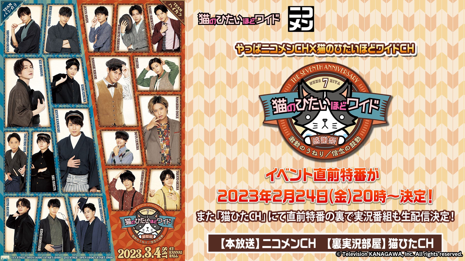これに伴い、ニコニコ「2.5次元やっぱニコメンチャンネル」にて、2月24日(金)20時から、イベント直前記念生放送を行うことが決定した。また番組タイトルで現在開設されているニコニコ「猫のひたいほどワイドチャンネル」でも、猫ひた番組リポーター“猫の手も借り隊”と一緒にイベント直前特番をワイワイ裏実況(コメンタリー)する生放送も決定。
