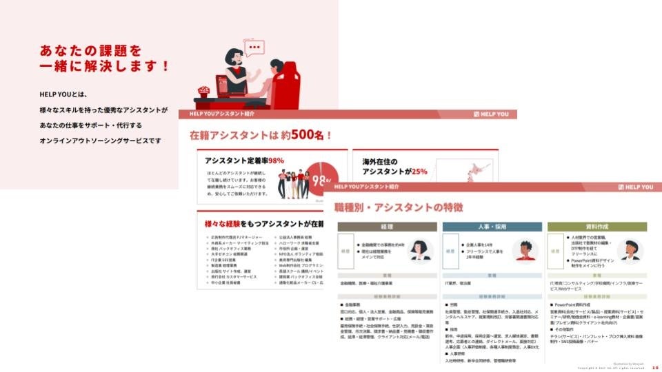 本資料では、HELP YOUに在籍するアシスタントの属性や、業務別の特徴、採用方法や研修制度、お客様の声を公開しています。