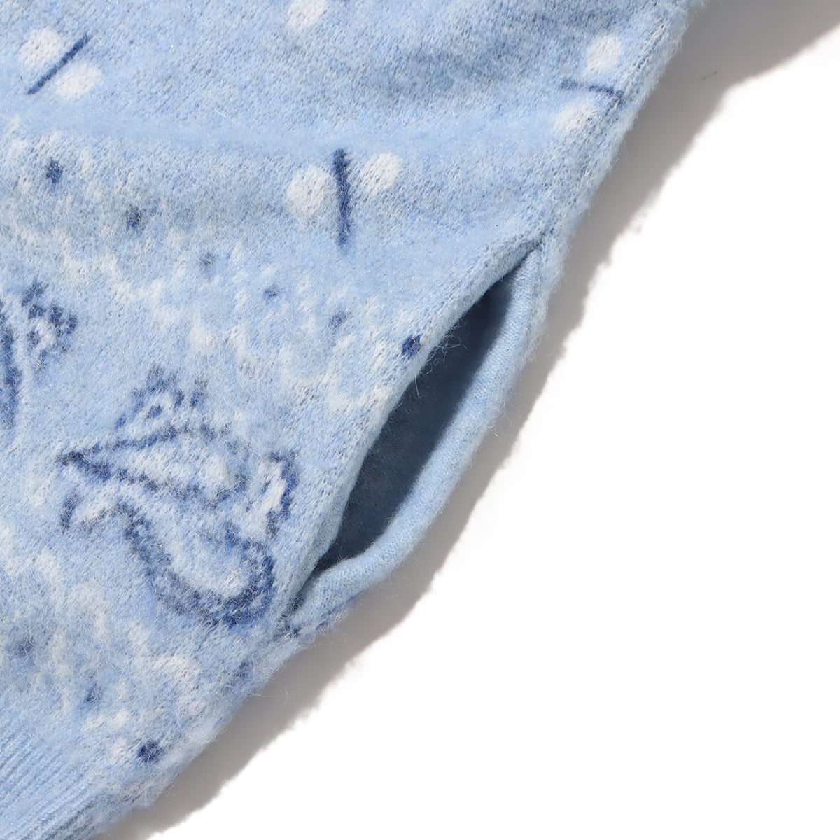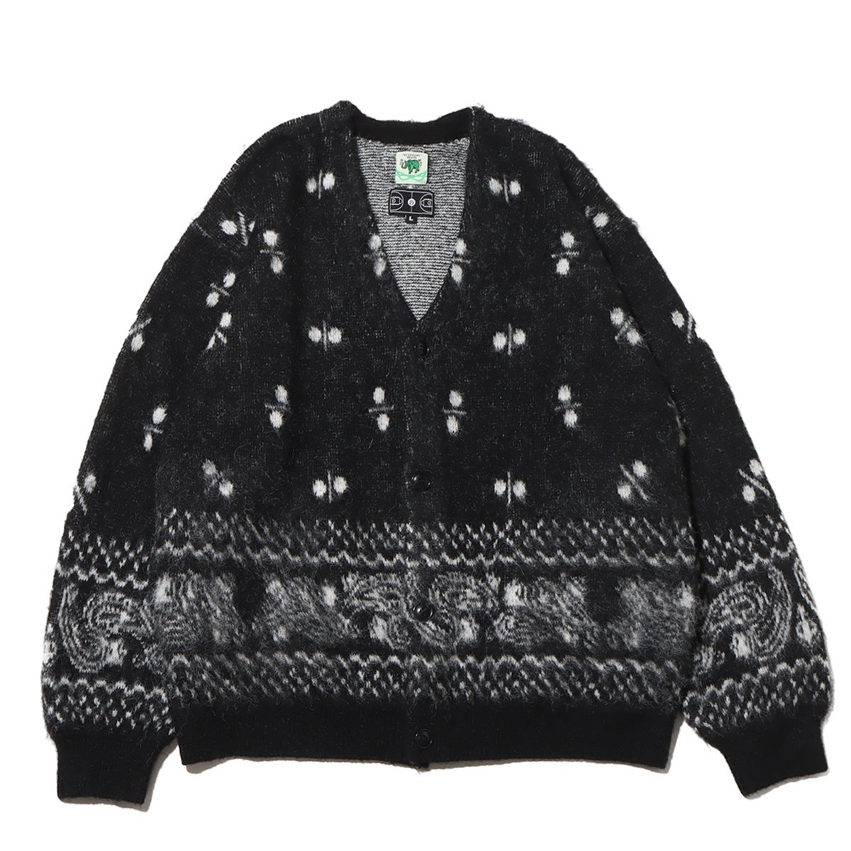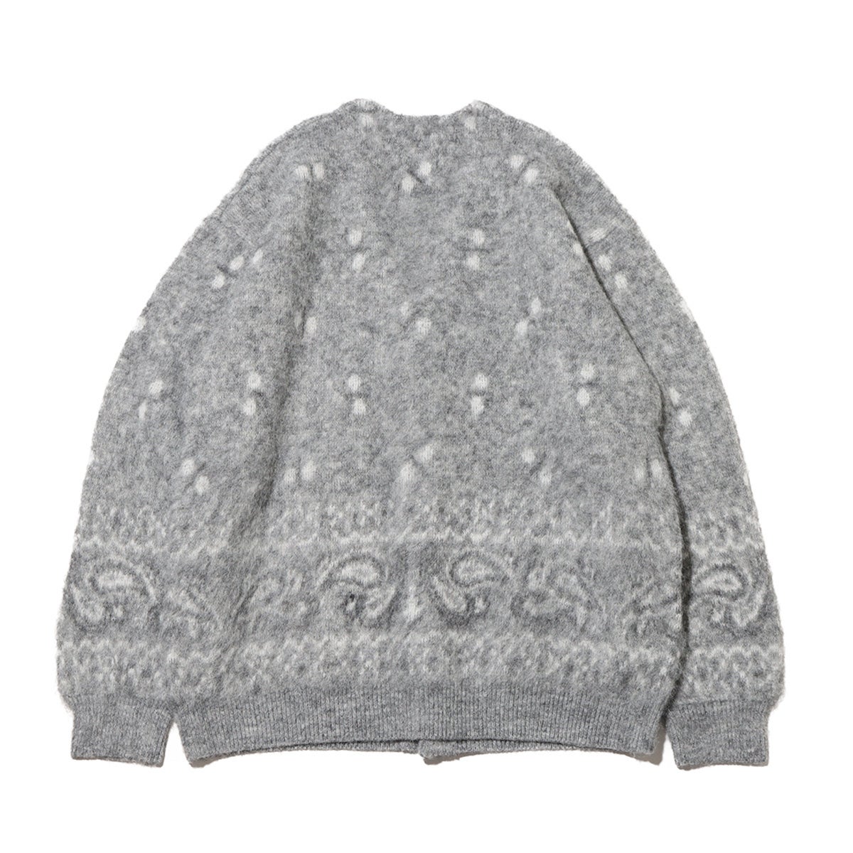 今回も「エレファント ブランド」とタッグを組み、60年代のヴィンテージバンダナの柄を書き下ろしたジャガード編みのカーディガンを展開。ディテールは、60〜70年代に見られるカーディガンをイメージした温故知新なルックスに仕上げ、素材には、ミドルゲージのモヘア調によるウール混の糸を使用してふわふわとしたソフトな着心地を実現。さらに、シャギー加工を施して毛足を立たせています。