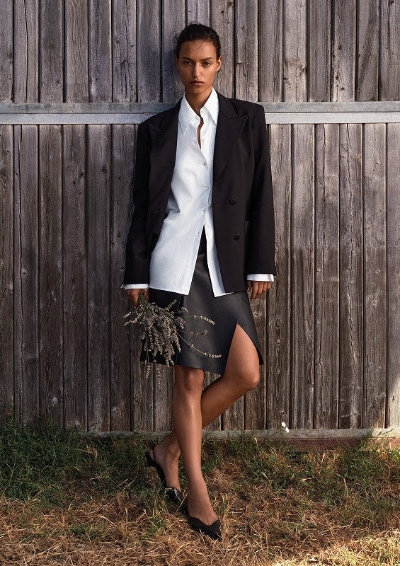 90年代のアルマーニを彷彿とさせる、メンズライクなブレザーにブライトなホワイトカラーのシャツのスタイルはモダンにアップデートされ、ニューヨーカーの通勤スタイルを思わせる雰囲気を演出します。一方、遊び心のあるホワイトTシャツがコーディネートに軽やかなアクセントを加えます。