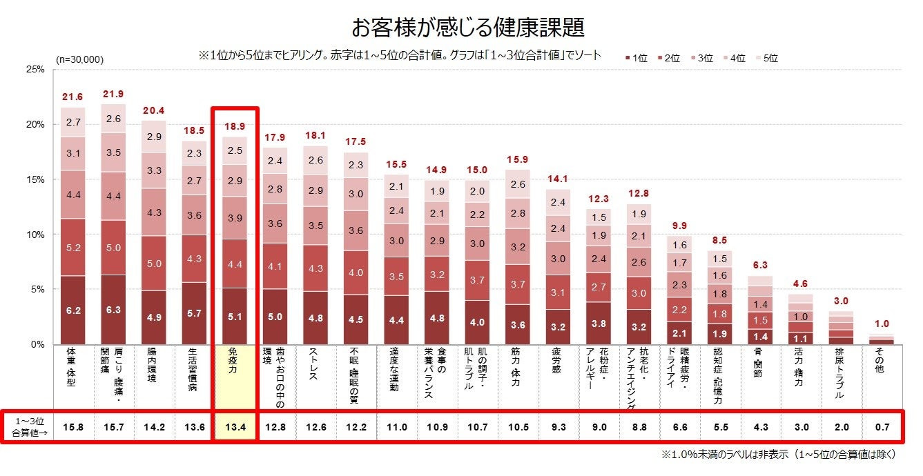 当社調査※1によると、お客様が感じている健康課題において、「免疫」は「ストレス」や「睡眠」、「適度な運動」などを上回りトップ5に入りました。