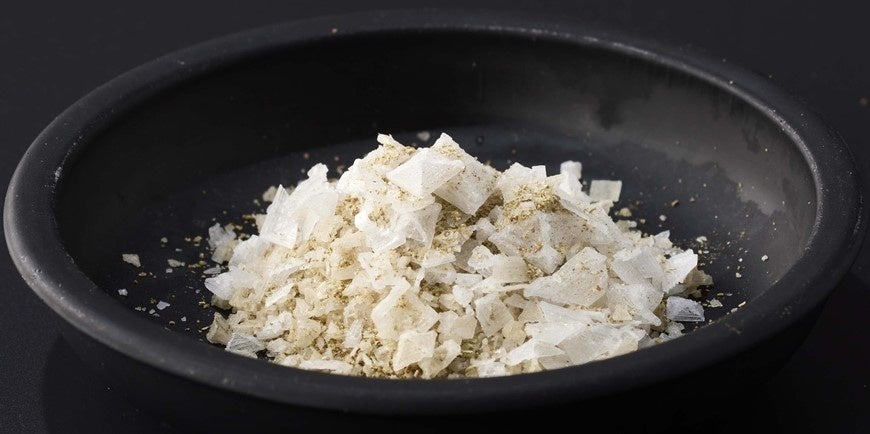 地中海の海水を平窯で炊き上げ、美しいピラミッド型の結晶になった塩を、そのままの形でご提供します。ブレンドしたローズマリーの爽やかな香りとまろやかな塩味が、ジューシーなステーキの旨みを引き立てます。