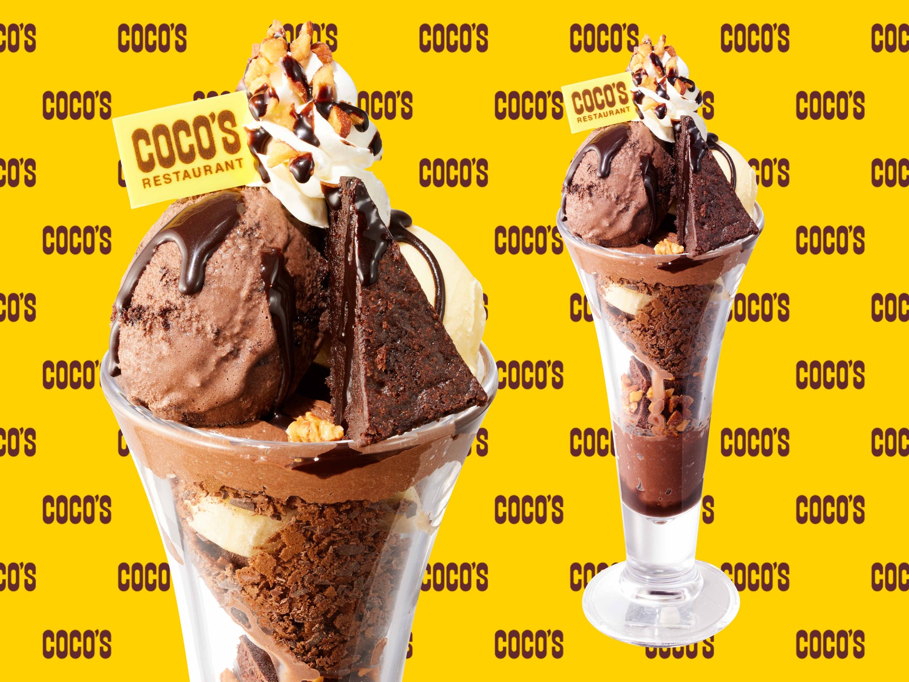 チョコプリンやガトーショコラ、ベルギーチョコアイスなどを使った、チョコレートづくしのパフェをブラッシュアップ。クレープのフレークやチョコフレーク、チョコクリームを追加し、より一層、様々な食感と濃厚な味わいが楽しめる一品に仕上げました。ココスのロゴを模ったチョコプレートが目を引きます。