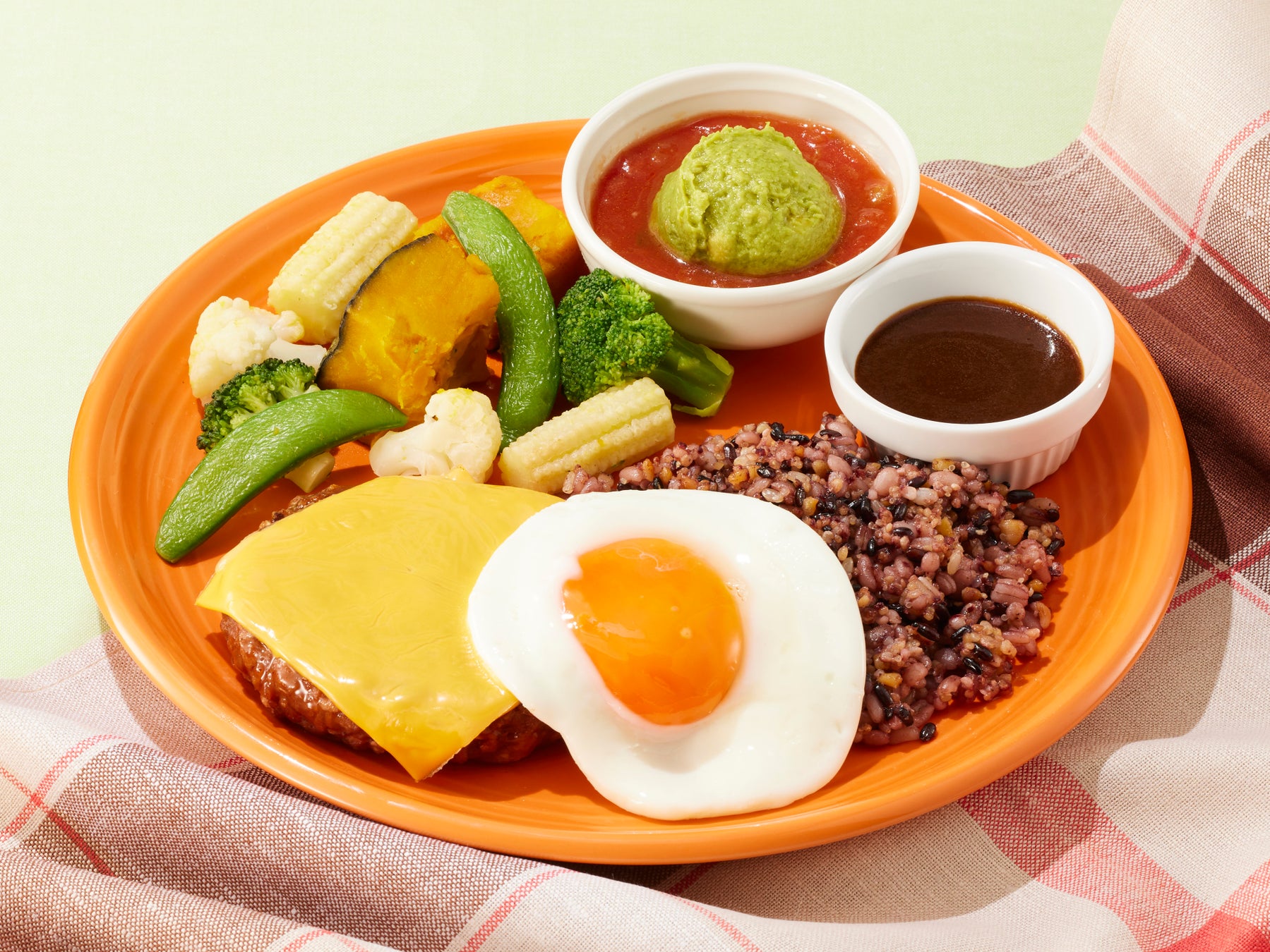 大麦や黒米、押麦、きびなど十六種類の穀類をブレンドしたごはんに、チーズをのせた大豆ミートハンバーグを添えました。