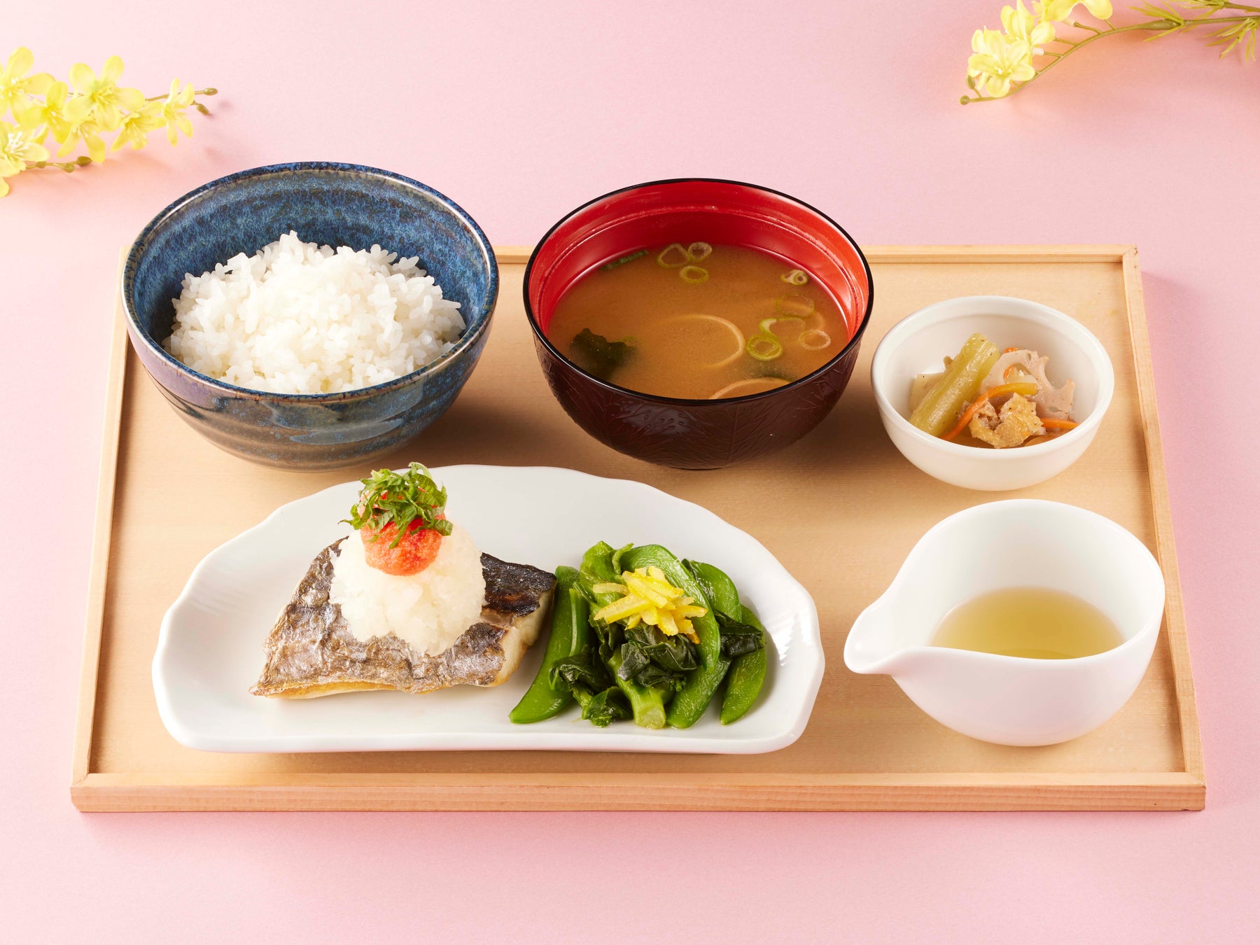 鰆にトッピングした、さっぱりとした鬼おろしと程よい塩味の明太子は柚子の風味とも相性抜群。旬の食材たっぷりの和膳をお楽しみください。