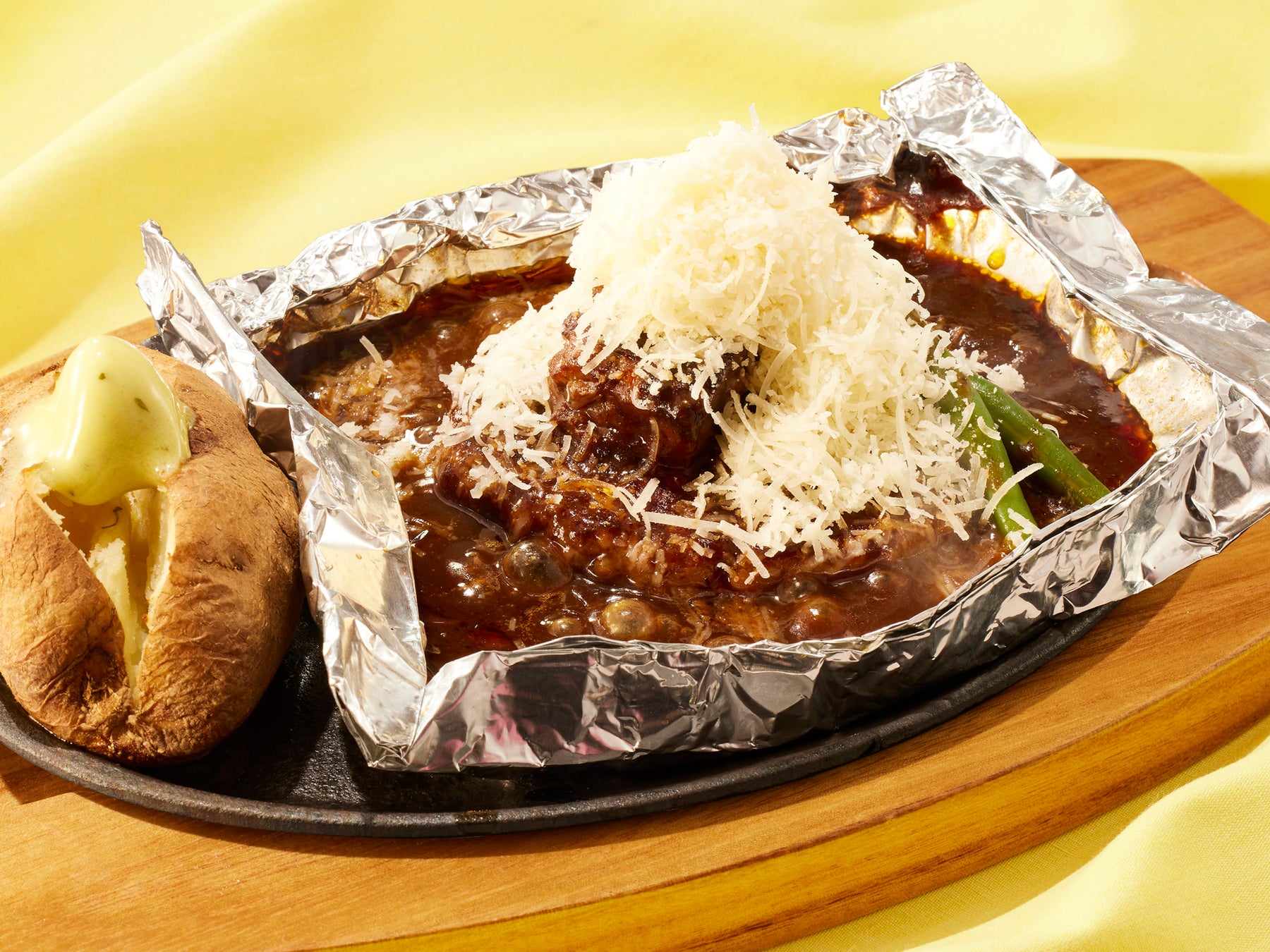 たっぷりのグラナパダーノを別添えでご提供します。グラナパダーノを山盛りかけることで、チーズの程よいコクと旨みがプラスされた濃厚なビーフシチューをジューシーなハンバーグと一緒にご堪能いただけます。