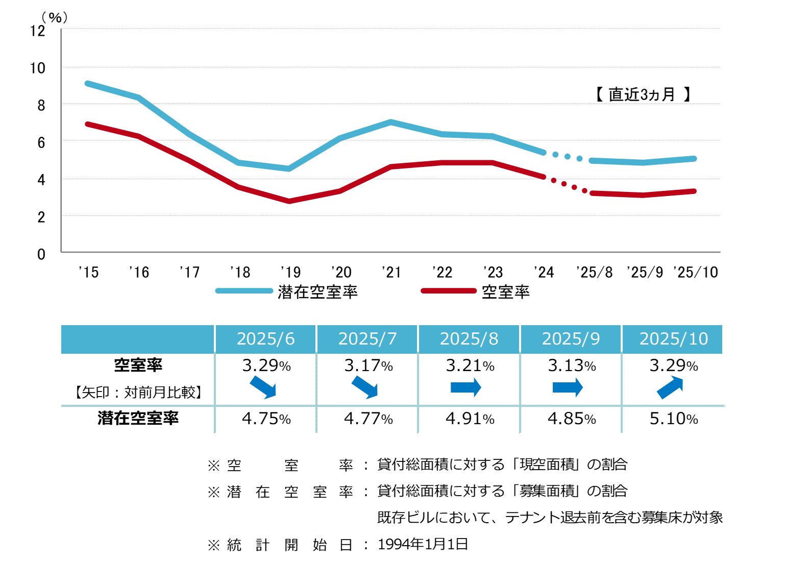 空室率は前月比プラス0.16ポイントの3.29%となり、前月から小幅に上昇した。空室を抱えて竣工した新築ビルが主な上昇要因だが、契約手続き中の区画もあり、今後は空室消化が進むとみられる。エリア別では「伏見」が前月比プラス0.7ポイントの大幅な上昇となっている。潜在空室率は前月比プラス0.25ポイントの5.10%だった。