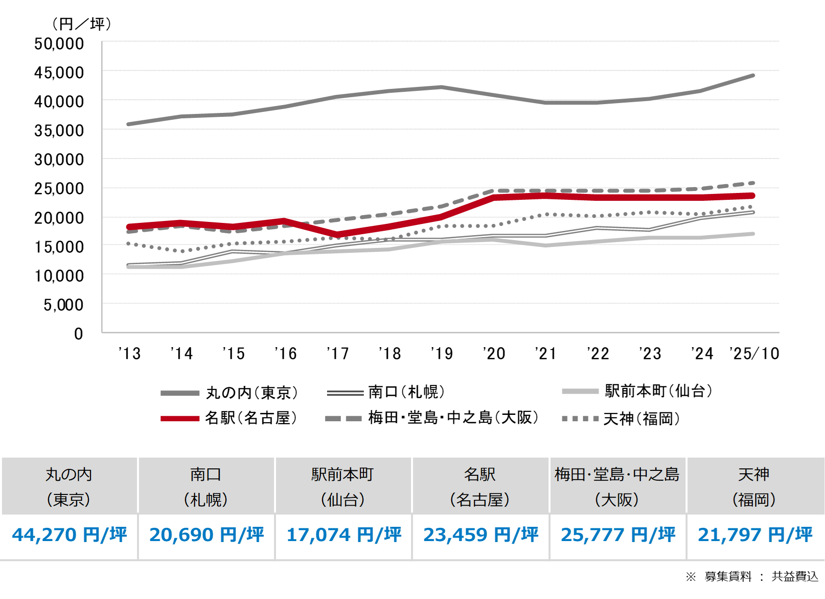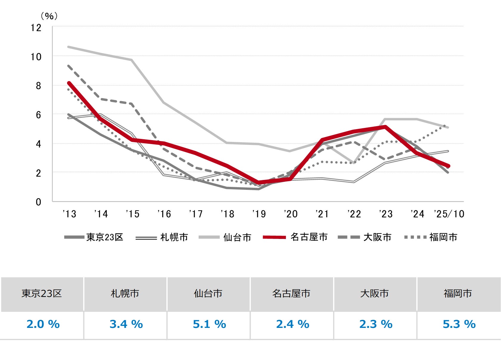 三幸エステート株式会社(本社:東京都中央区、取締役社長:福島正二郎)は、2025年10月度の名古屋市オフィス賃貸状況(空室率&現空面積:全規模、募集賃料&募集面積:全規模、規模別空室率、主要エリア※1空室率:全規模)および全国6大都市(東京・札幌・仙台・名古屋・大阪・福岡)の大規模ビルのマーケットデータをまとめた「オフィスマーケット2025年11月号名古屋」を公表します。