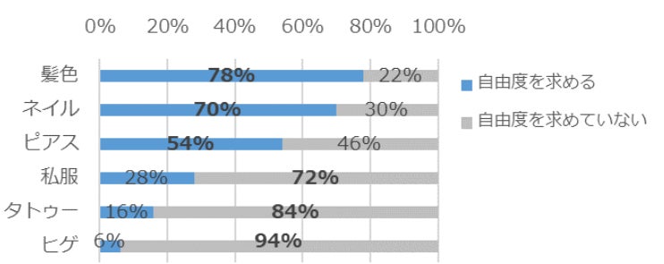 ヒゲ、タトゥーについて自由度を求める人は少ないものの、ネイル、髪色、ピアスについては半数以上が自由度を求めていることがわかります。
