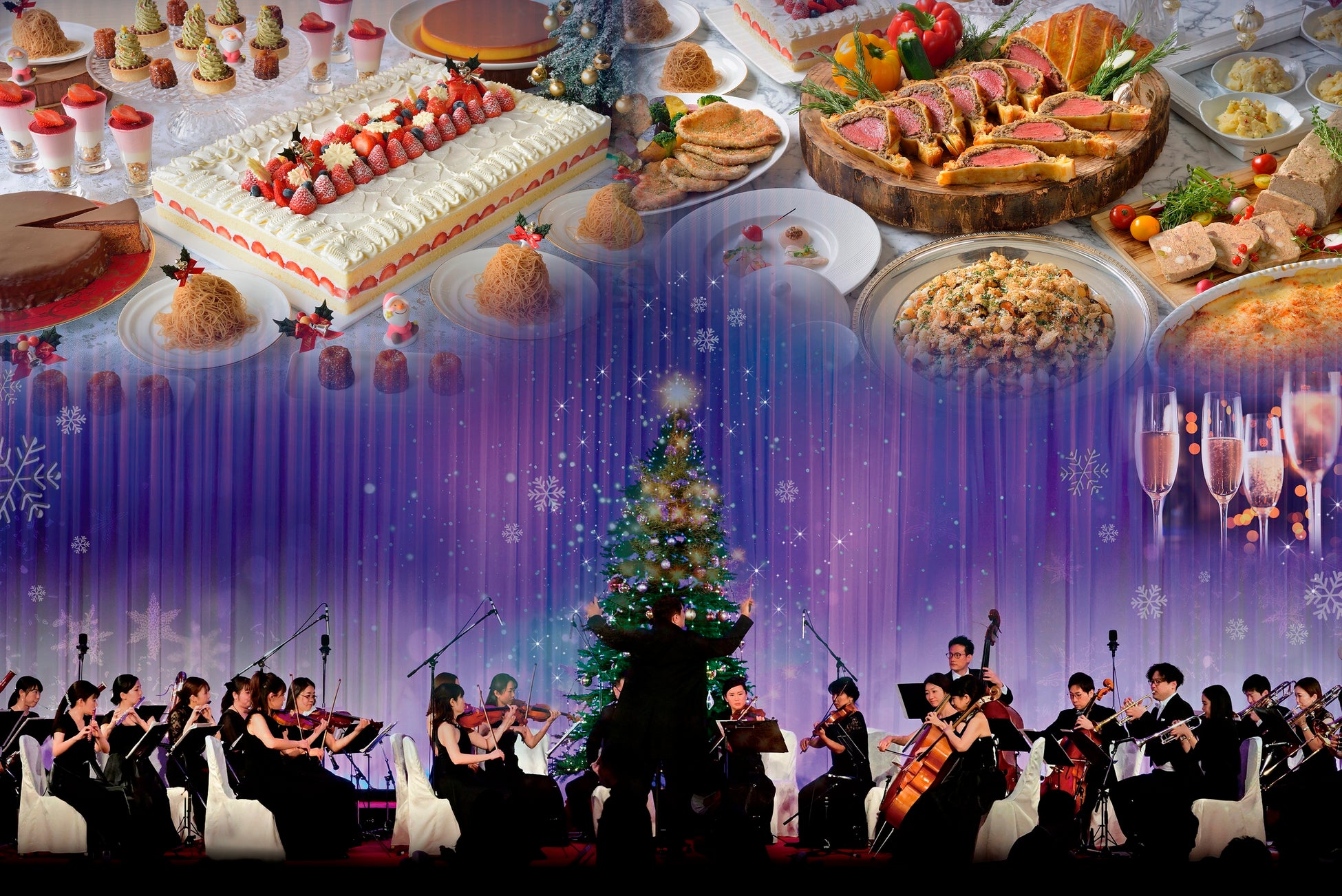 世界三大珍味を使用した牛フィレ肉とフォアグラのパイ包み焼き ウェリントン風トリュフソースなどの西洋の伝統的なクリスマス料理のほか、ドイツの「三大B」が愛した料理、お子様も喜ぶチキンオムライスやマカロニチーズに目の前で切り分ける大きなクリスマスショートケーキや目の前で仕上げるモンブランなど、ホテルのビュッフェならではの、料理やスイーツを多彩に取り揃えています。
