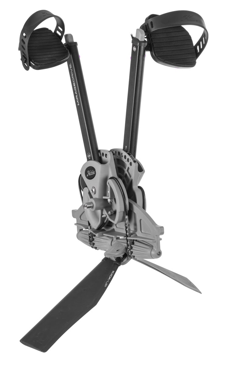 腕よりもはるかに強く耐久性のある人間の脚力を効率的な推進力に活かす方法として、1997年に開発された足漕ぎの推進装置です。この装置は、ペンギンが泳ぐ翼の動きを研究し開発されたもので、国際特許を取得しています。