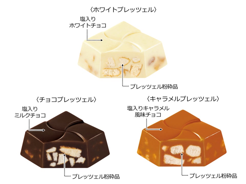 塩入りのホワイトチョコ・ミルクチョコ・キャラメルチョコに粉砕プレッツェルを合わせました。