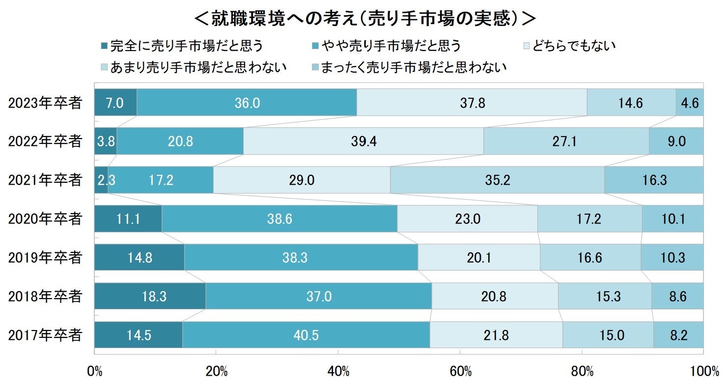 ○売り手市場だと感じる学生は全体の4割強(43.0%)。コロナ禍前に迫る