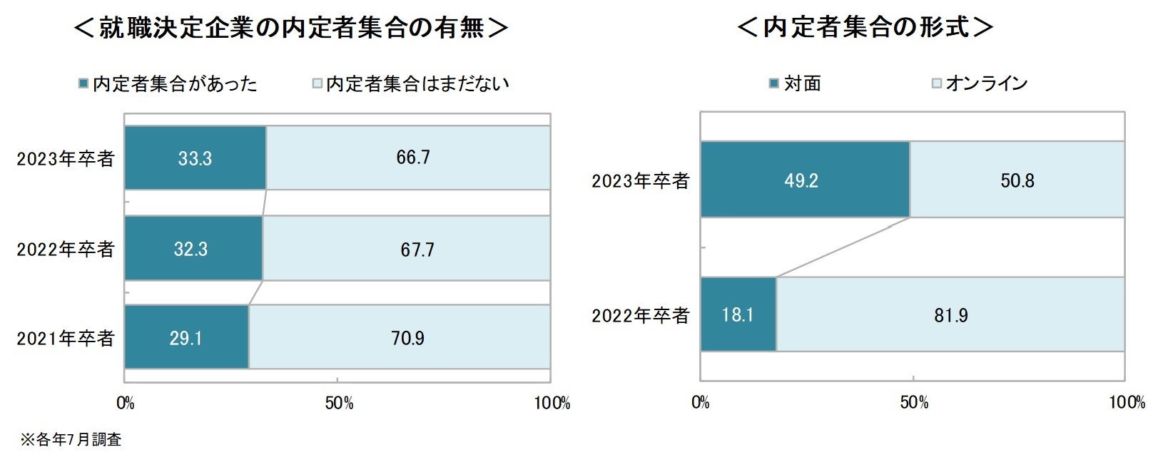 ○調査時点で「内定者集合があった」33.3%。前年同期調査(32.3%)と変化なし