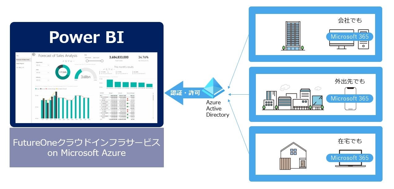 Power BI画面にアクセスする際は、認証クラウドサービス(IDaaS)であるAzure Active Directoryを介して、お客様が所有するMicrosoft 365アカウントに紐付いたシングルサインオンができます。Power BI画面へのインターネット経由でのアクセスは、Azure Active DirectoryおよびMicrosoft 365にて提供されるセキュリティ対策やユーザー管理機能によって守られており、オフィスでの利用に加え、自宅や外出先からスマートフォンやタブレットで基幹業務データの情報分析結果を安全に閲覧することができます。