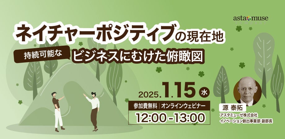 アスタミューゼ株式会社(本社:東京都千代田区、代表取締役社長 永井歩)は、2025年1月15日(水)12:00-13:00に、業界を問わず、サステナビリティに関する業務を担当している方、興味をお持ちの方を対象とした新作の無料ウェビナー「"ネイチャーポジティブ"の現在地-持続可能なビジネスにむけた俯瞰図」を開催いたします。