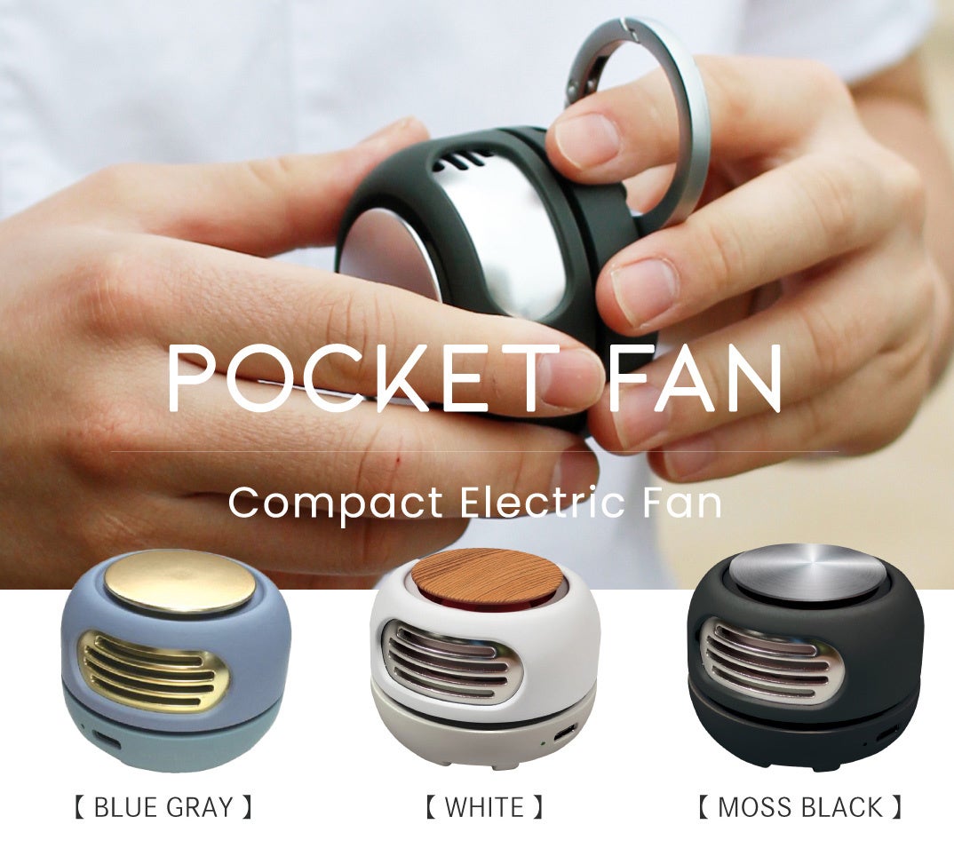 「ポケットファン」は、軽量で手の中に収まるコンパクトサイズの携帯用扇風機です。
