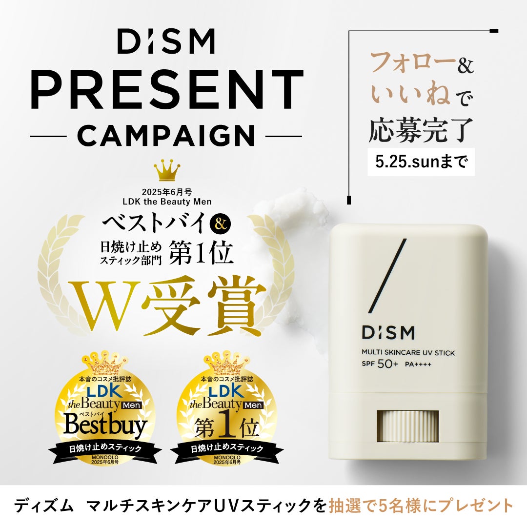 「LDK the Beauty Men」でベストバイ・1位とのW受賞を記念し、公式XとInstagramにて合計5名様に「ディズム マルチスキンケアUVスティック」が当たるキャンペーンを実施いたします。