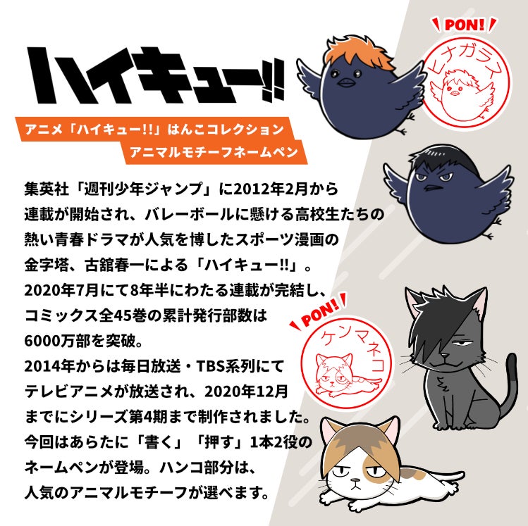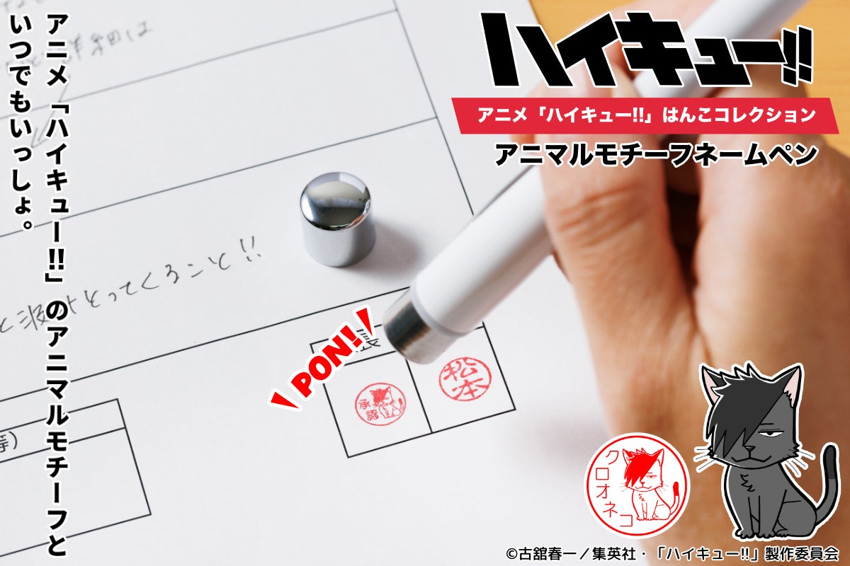 今回、新作として登場した「アニマルモチーフネームペン」は、アニメ「ハイキュー!!」に登場するキャラクターを動物などに模した人気のアニマルモチーフと自分の名前やメッセージなどを彫刻した浸透印と、黒インクのボールペンが一体となった「ハイキュー!!」好きのための筆記具です。