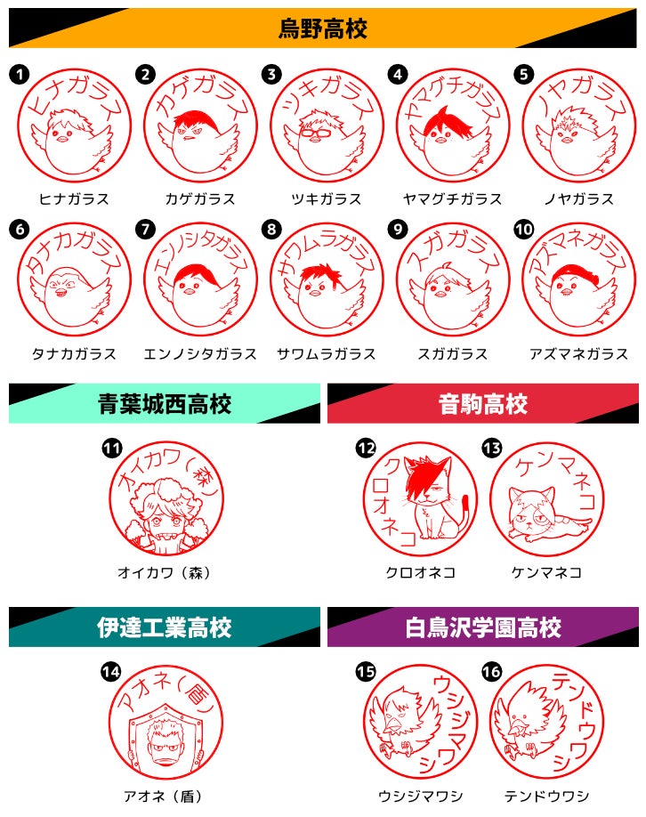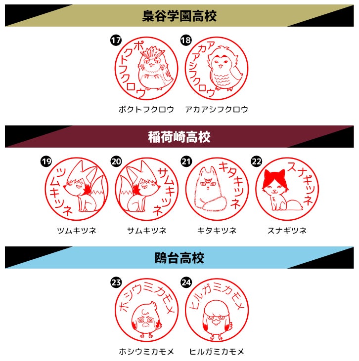 アニマルモチーフはこちらの24種類。ヒナガラスやカゲガラスはもちろん、クロオネコやケンマネコ、ボクトフクロウ、ツムキツネ、サムキツネまで、烏野、青葉城西、音駒、伊達工業、白鳥沢学園、梟谷学園、稲荷崎、鴎台の各校のキャラクターが選べます。