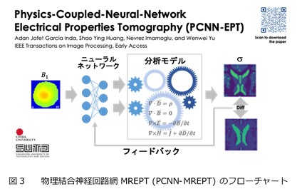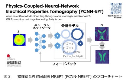 千葉大学フロンティア医工学センターの兪文偉教授、大学院博士後期課程研究員Adan J. Garcia Inda、及びSingapore University of Technology and DesignのProf. Huang Shaoying、国立研究開発法人産業技術総合研究所 デジタルアーキテクチャ研究センターのNevrez Imamoglu主任研究員らの研究チームは、磁気共鳴電気特性トモグラフィ(Magnetic Resonance Electrical Property Tomography: MREPT)と機械学習(AI)を用いたモデルの統合により、高いノイズ耐性と精度で人体の組織が持つ電気特性(誘電率・導電率の分布など)を推定する技術を開発しました。