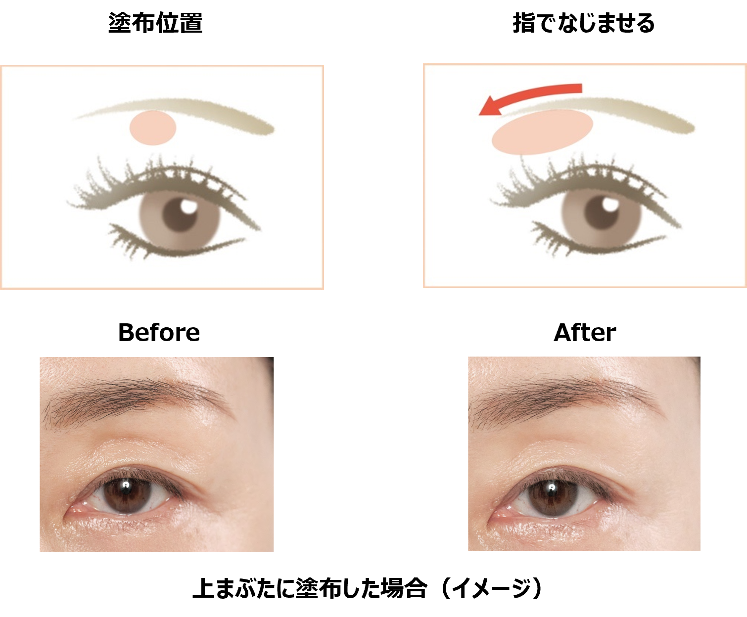 中央より少し外側、眉山の下あたりに塗布し、目尻に向かって指で、一方向になじませます。5分経つと、上まぶたのたるみがおさえられて目立ちにくくなり、すっきりした印象を作ることができます。