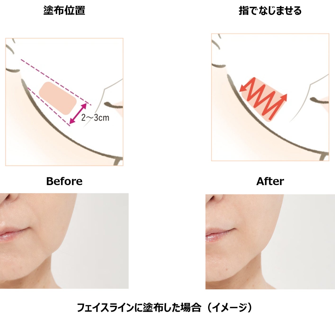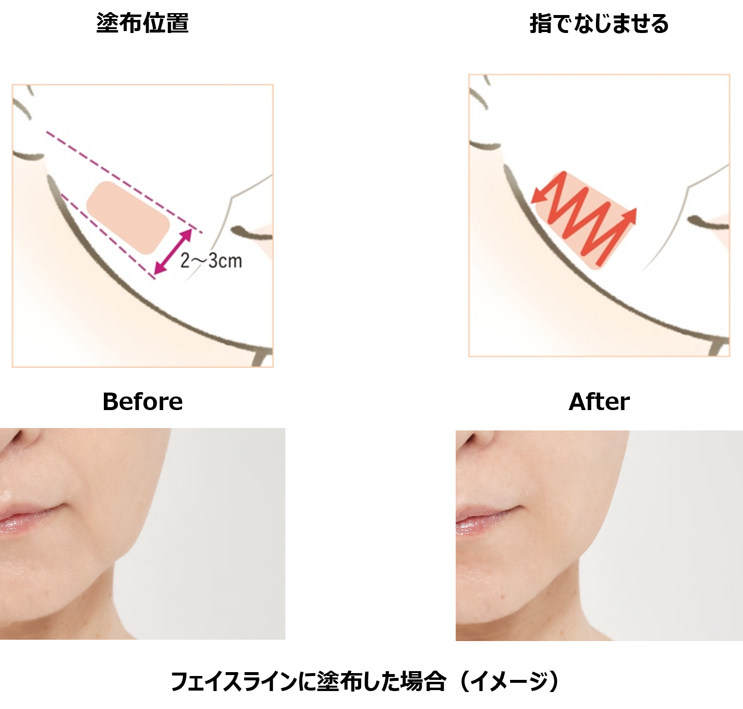 ほうれい線でのシワとたるみを目立ちにくくするしくみをベースに、新たに、顔のシワについては「シワを挟むように塗る」、たるみの目立つ部分には「たるみの上に塗る」ことで、各部位にご対応いただけます。