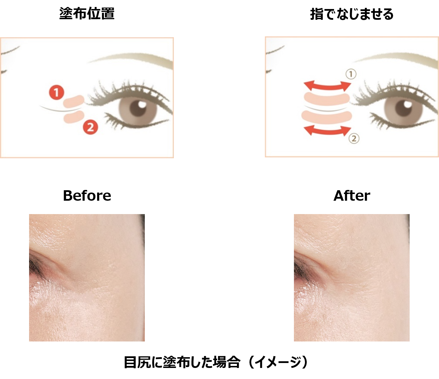 シワを挟むように、シワの長さの半分くらい塗布します。指を左右に動かし、シワと同じ長さまでなじませます。5分経つと、シワが目立ちにくくなります。目の中や眉毛・まつ毛につけないようにします。