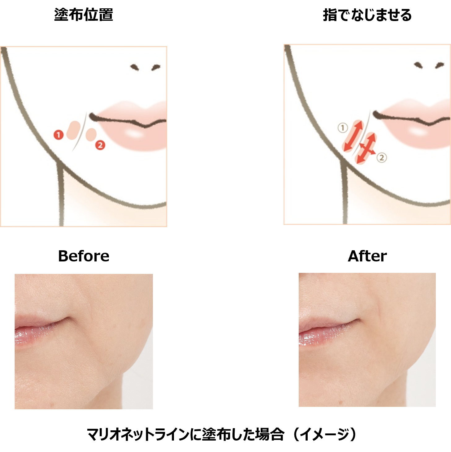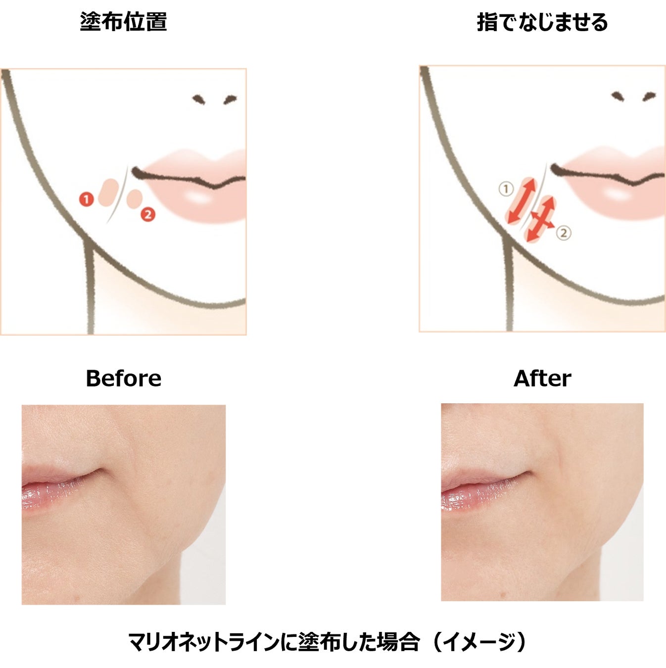シワの外側にはシワの長さの半分くらい、シワの内側にはちょこんと置くようにつけて、2か所でシワを挟むように塗布します。外側は、つけたところからシワの終点まで、指を上下に動かしなじませます。内側は、指を上下、左右に動かしなじませます。5分経つと、マリオネットラインが目立ちにくくなります。