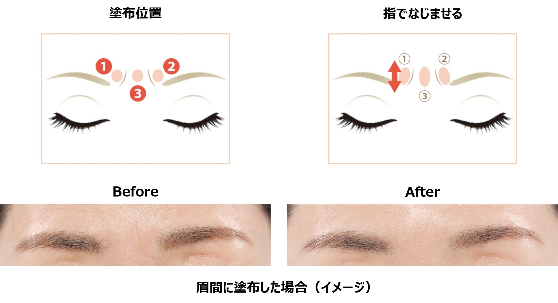 シワを挟むように塗布します(こちらの図は、眉間にしわが2本ある場合の説明となっています)。指を上下に動かし、シワと同じ長さまでなじませます。5分経つと、シワが目立ちにくくなります。