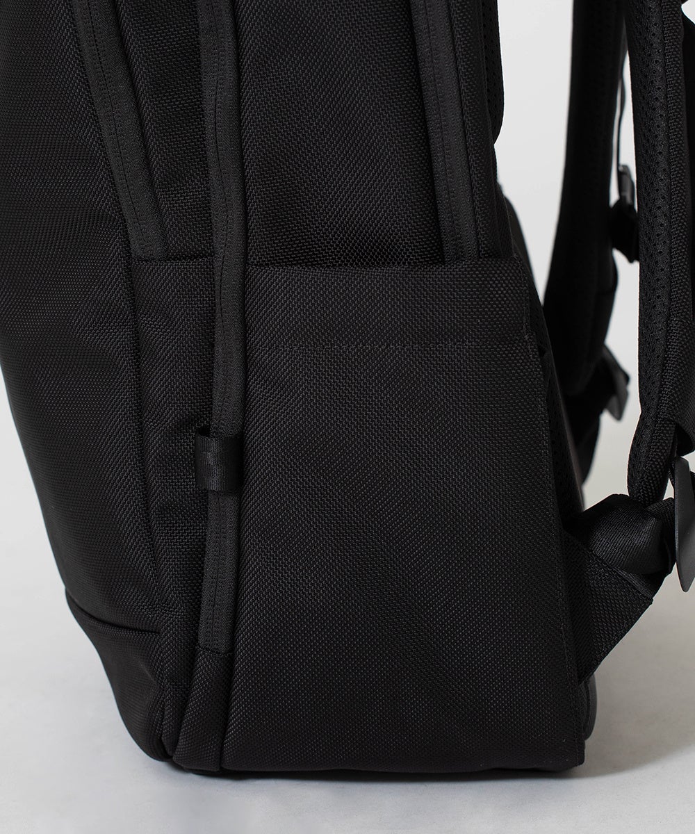 サイドパネルには、オープンタイプのサイドポケットを搭載。開口部はゴムで伸縮するつくりで、ドリンクボトルや折りたたみ傘を入れたときも適切にホールドします。またスリットにはメッシュ生地が使われており、ポケット内に溜まった湿気を放出する役割も果たします。