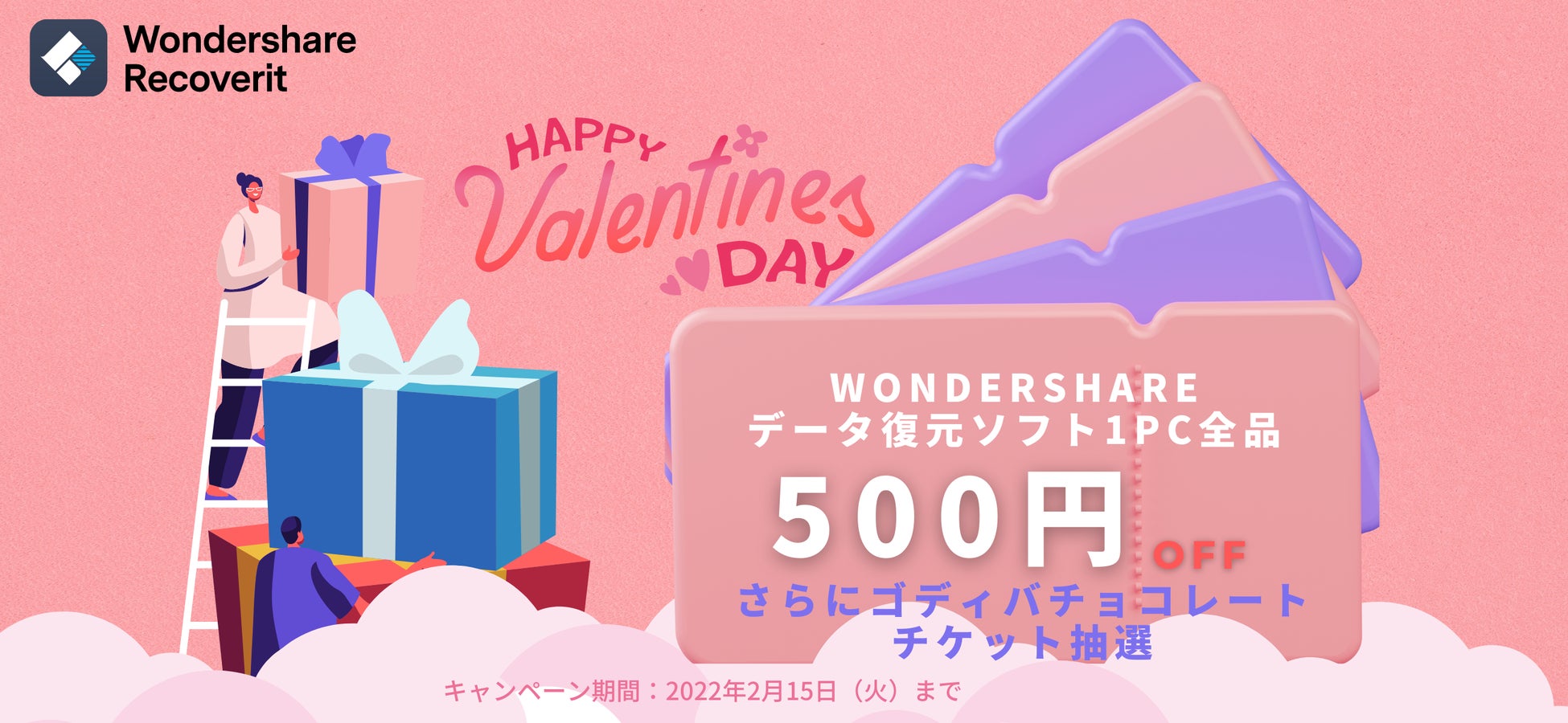 世界150か国以上で利用されるソフトウェアを手掛ける、株式会社ワンダーシェアーソフトウェア(東京都千代田区、代表:呉太兵)は、誤削除やトラブルが原因で消えたPC上のファイルを簡単に復元できるPCデータ復元ソフトWondershare Recoverit(ワンダーシェアー リカバリット)とファイル修復ソフトWondershare Repairit(ワンダーシェアー リペアリット)が、2022年2月8日(火)~2022年2月15日(火)まで、シリーズ全製品が500円OFFになるバレンタインキャンペーンを実施いたします。