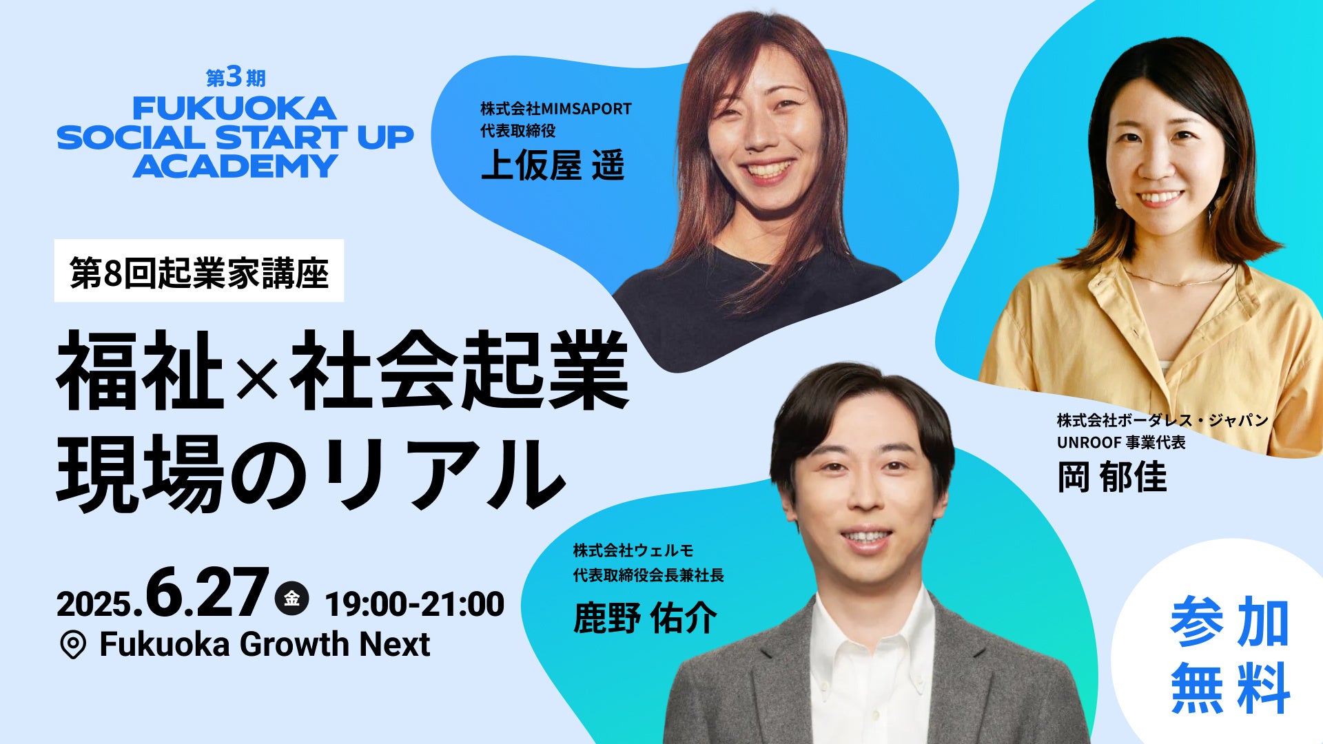 本プログラム通して第8回となる起業家講座は、福祉の社会課題解決に取り組むために起業し、現在も事業を通してソーシャルインパクトを生み出し続ける3名が登壇し、社会起業や社会課題解決に取り組む現場のリアルについてお話しします。