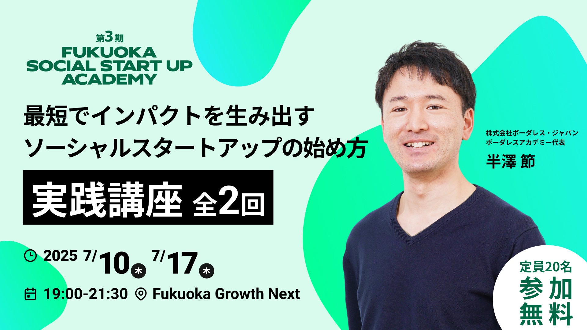 世界13カ国で50以上のソーシャルビジネスを展開する株式会社ボーダレス・ジャパン(本社:福岡県福岡市、代表取締役:田口 一成、以下 ボーダレス・ジャパン)と福岡市の官民共働型スタートアップ支援施設「Fukuoka Growth Next」(所在地:福岡県福岡市、事務局長:池田 貴信、以下FGN)は、約2ヶ月間を通じて社会課題解決につながるビジネスアイデアのベースを作る社会起業プログラム「FUKUOKA SOCIAL START UP ACADEMY」(以下本プログラム)の第3期を2025年6月より開講することを発表します。