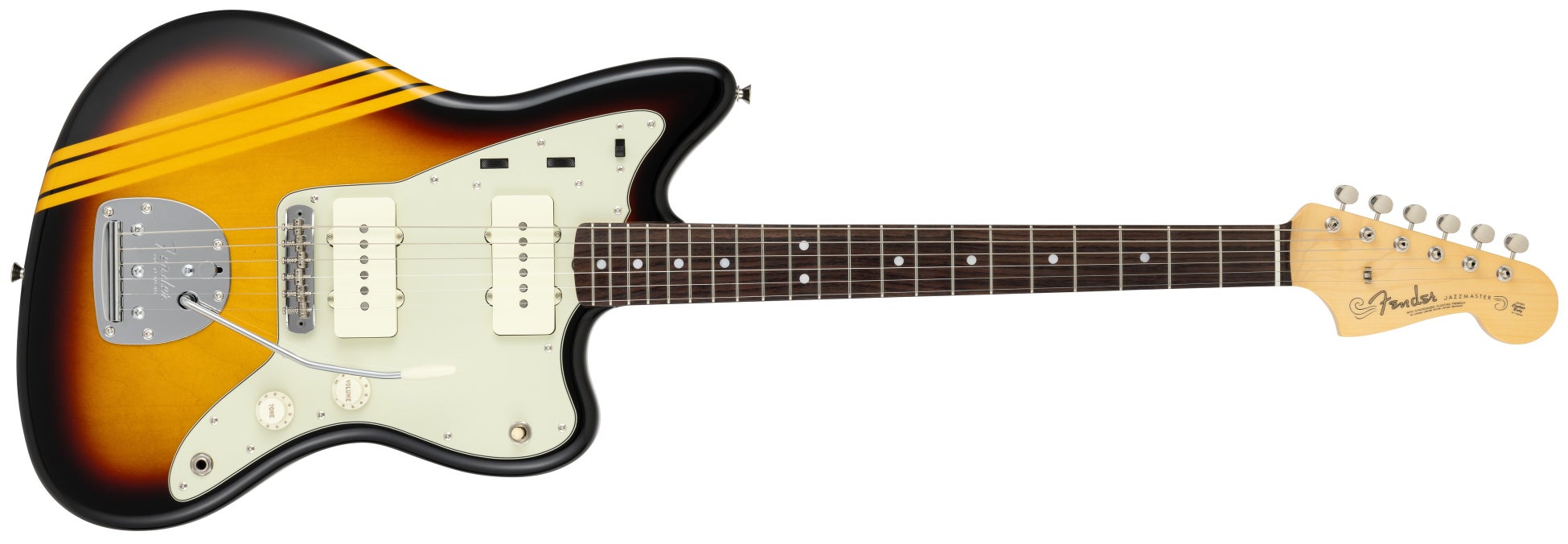Fenderの伝統的なカラーである3カラーサンバーストに、60年代に登場したコンペティションラインのデザインを組み合わせたモデルです。ブラックのボディに3カラーサンバーストのラインをあしらったデザインと、3カラーサンバーストのボディにエイジドナチュラルのラインを施した2種類を展開。どちらも現代的で落ち着いた配色に仕上げることで、ありそうでなかった、斬新ながらも上品なルックスが特徴です。(販売モデル:Telecaster、Stratocaster、Jazzmaster、Jaguar、Jazz Bass)
