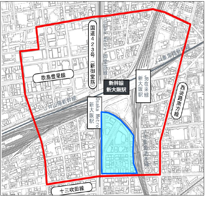 ※赤枠は 2022年10月28日に内閣府より指定された「新大阪駅周辺 都市再生緊急整備地域」