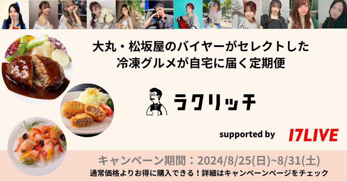 本イベントでは、「17LIVE」で活躍する12名のイチナナライバー(「17LIVE」にてライブ配信を行う配信者)が1週間にわたり、大丸・松坂屋のバイヤーがセレクトした冷凍グルメが自宅に届く定期便サービス「ラクリッチ」で味わうことができるメニューの味わいや特性、サービス内容の魅力を紹介し、販売を促進します。