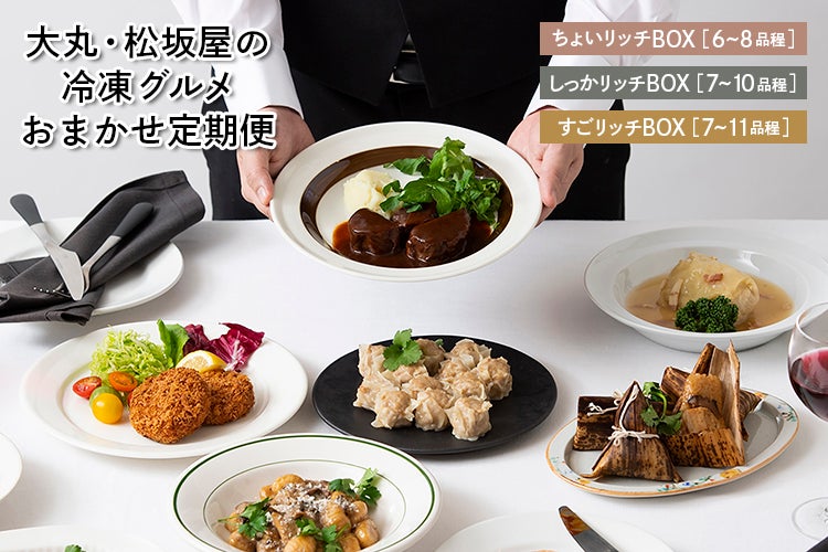 大丸松坂屋百貨店が長年培ってきた「目利きバイヤーのネットワーク力」を活かすことにより実現した、いつでもデパ地下クオリティの“贅沢なグルメ”を楽しめるサービスです。バイヤーが厳選した使いやすい少量サイズの商品を6~11品程度でセットにし、定期で冷凍配送。お客様にはメニュー内容の全容はお見せせず、一部の商品のみ公開。「届いたときのお楽しみ」を演出し、”おまかせ”でおいしい出会いをご提供しています。