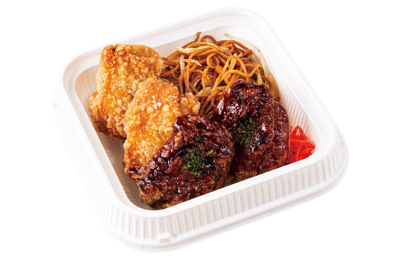 ソースからあげ2個、カリッともも2個、千切りキャベツまたは焼きそば、ご飯
