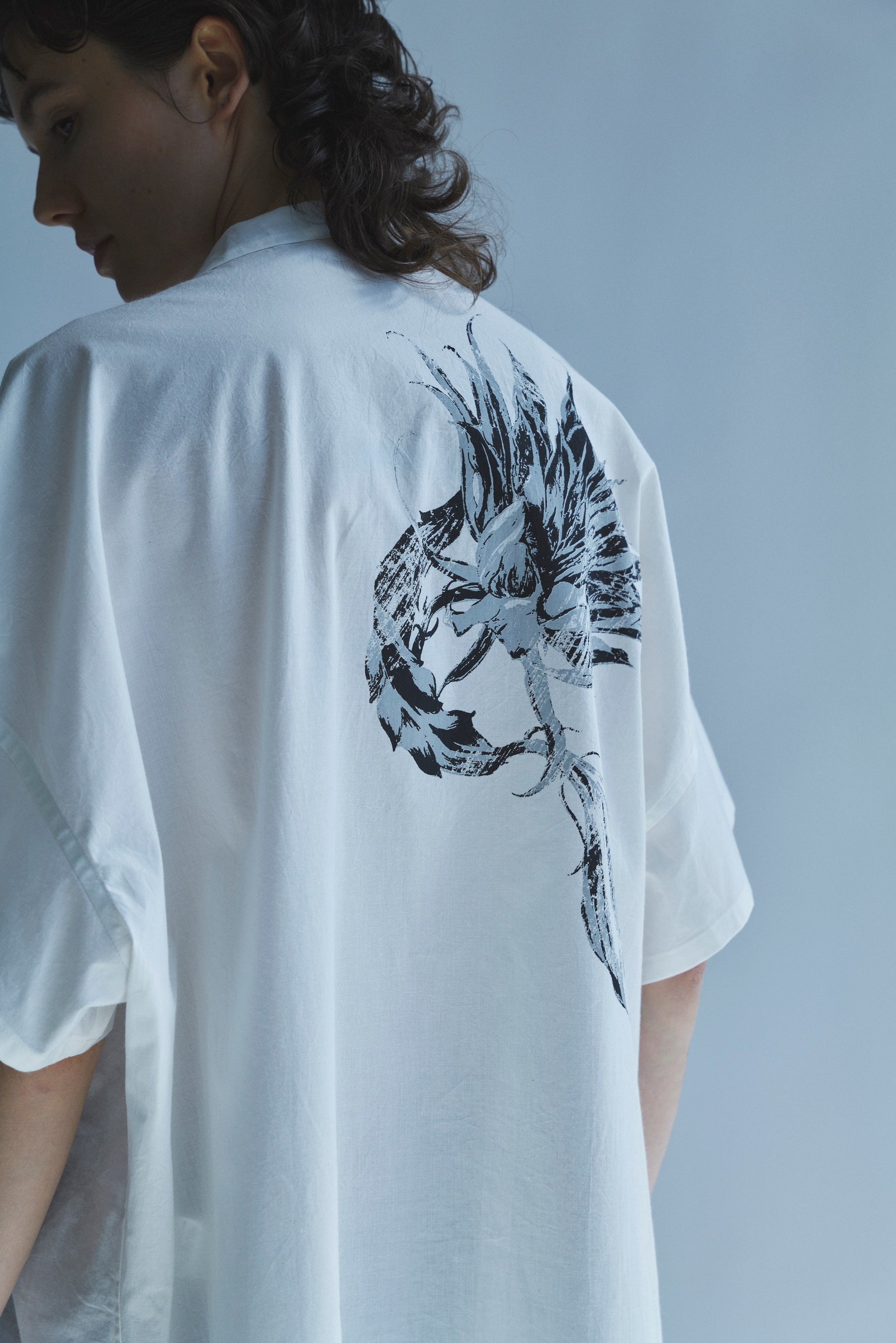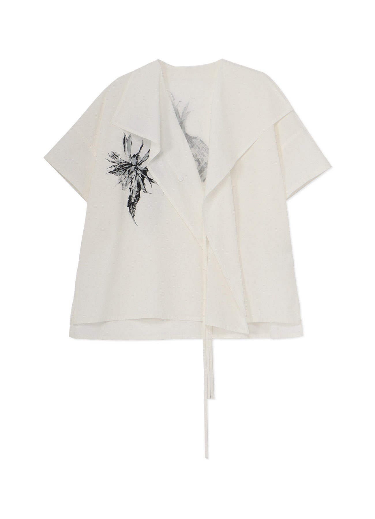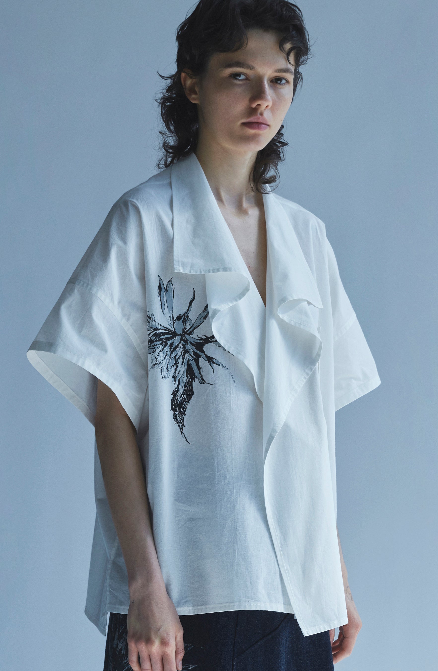 布を羽織ったようなデザインのユニークなシャツ。前を留めず開けたまま、あるいは紐を結び作務衣のように、またはボタンを留める着方が可能。襟のドレープをフラットにするとセーラーカラーのようになり表情が変化する。胸と背中に、サボテンの花のプリント。