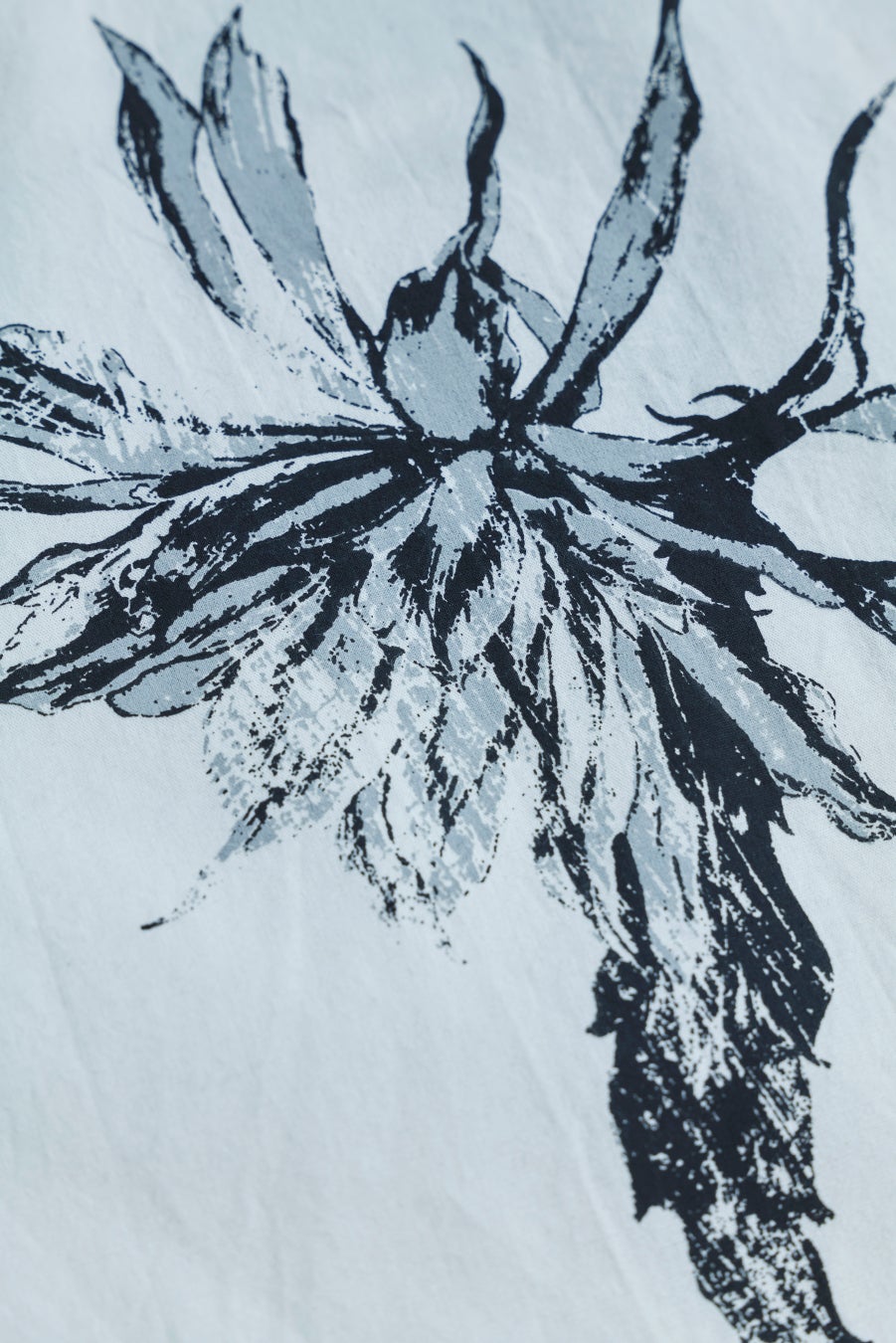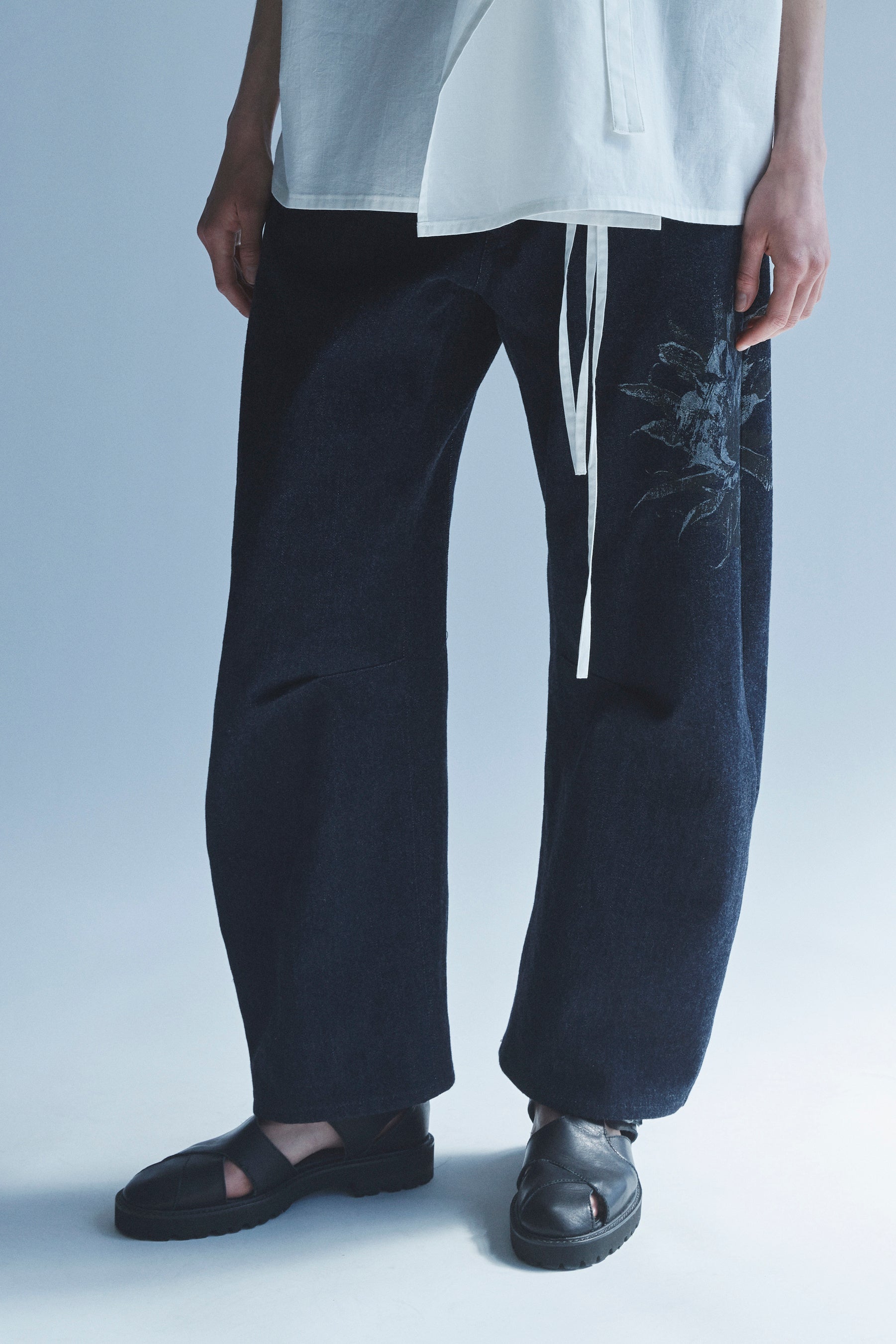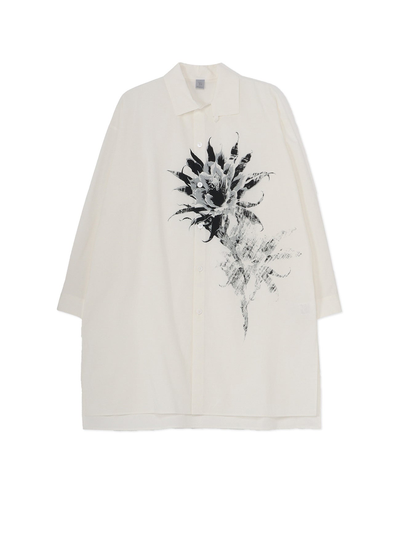 「Spiber」が開発·生産を行う構造タンパク質素材「Brewed Protein™ 繊維」をもちいて、Y'sを象徴するブロードコットンシャツやデニムパンツを表現。掠れたような表現が特徴的なサボテンの花のプリントが、本コレクション4型のピース全てに配されています。