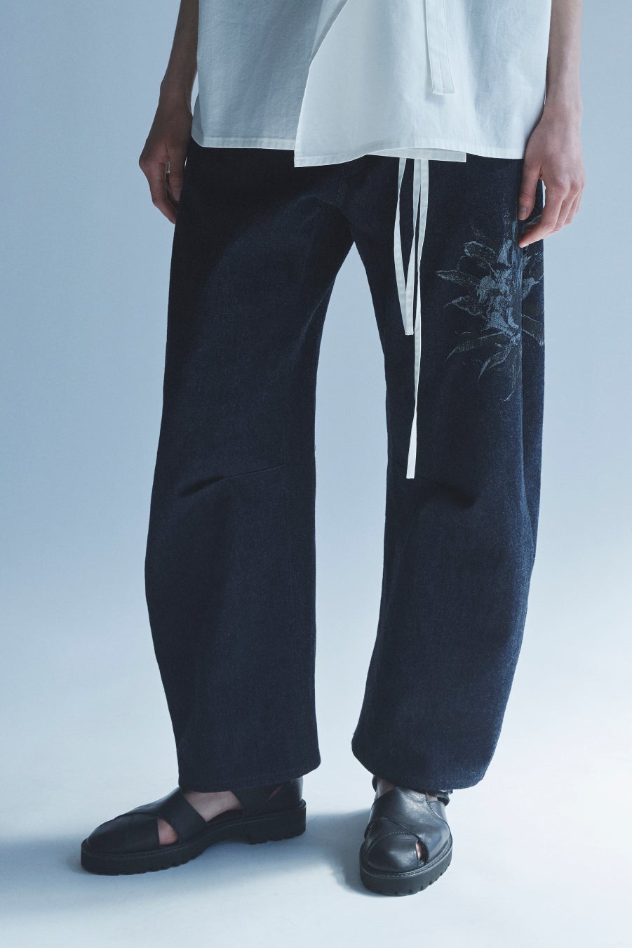 内側に丸いラインを描くパンツ。左側面にサボテンの花がプリントされる。